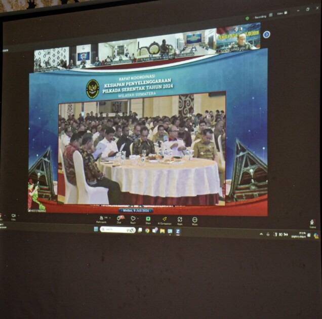 Secara virtual Wakil Wali Kota Metro Qomaru Zaman , didampingi Pelaksana Kesbangpol Hartawan Jaya Guna, Analis Kebijakan Ahli Muda Erfir Thabrani Indra, dan Analis Hubungan Antar Lembaga Septiana Wati mengikuti Rapat Koordinasi Kesiapan Penyelenggaraan Pilkada 2024 wilayah Sumatera di Medan, Sumatera Utara, Selasa (9/7/2024).